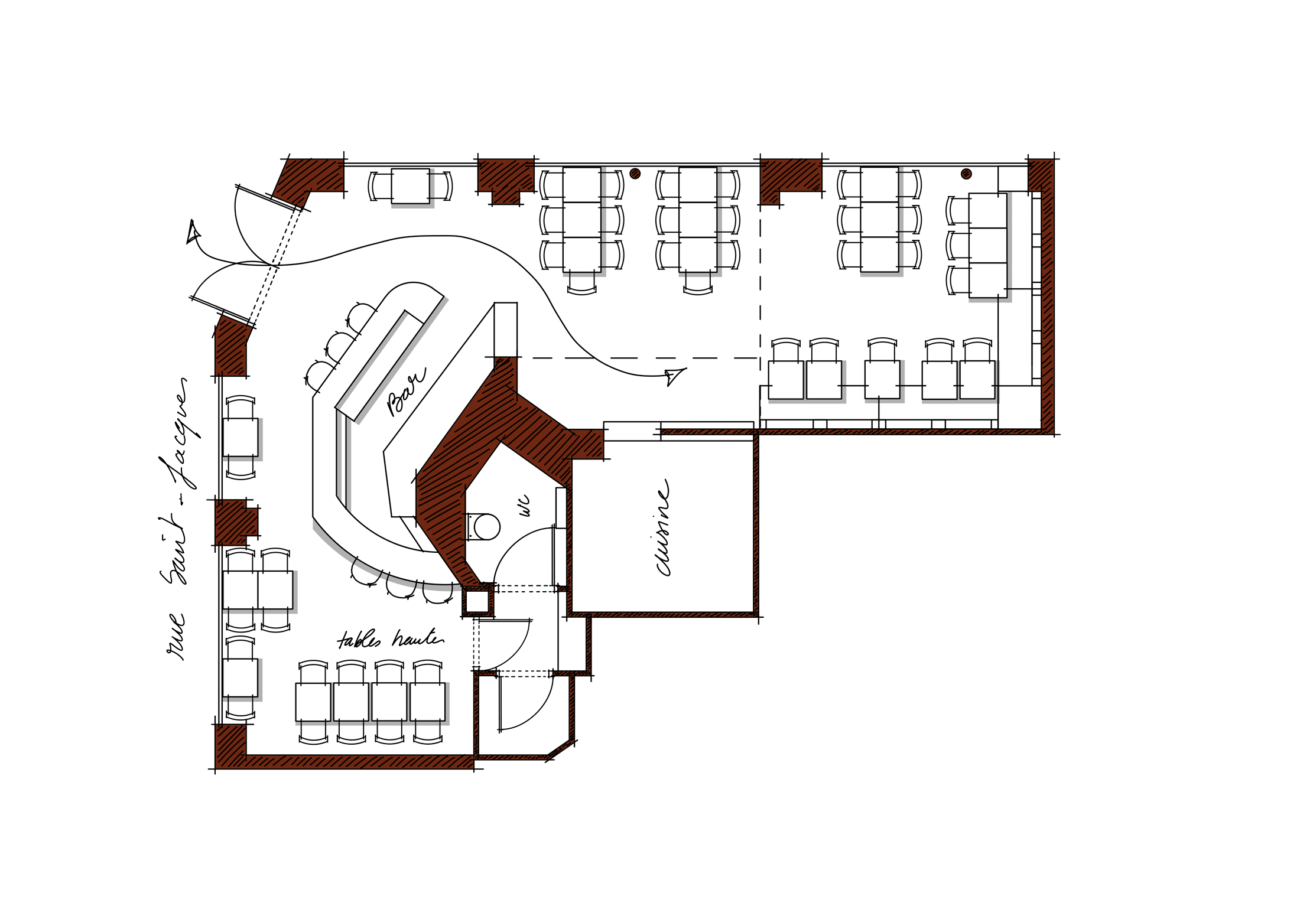 Seoul Mama 5ème perpétue l’esprit cantine de quartier très convivial qui faisait déjà la signature du premier établissement. L’objectif a été de créer 2 ambiances et dynamiques dans un même lieu : un espace « bistrot » près de la cuisine et un coin convivial autour du bar pour manger sur le pouce ou boire un verre.